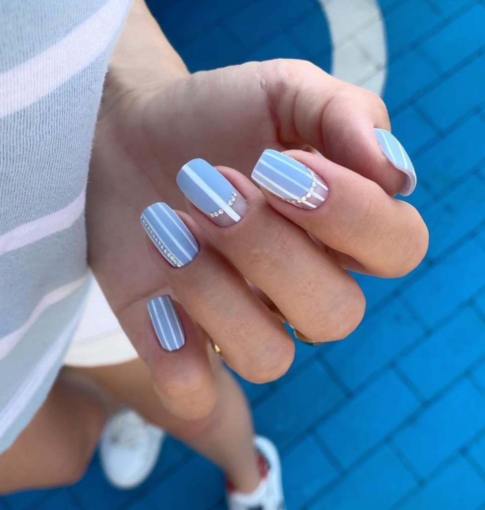 These small, square nails embody the summer’s quietness, for those who love it this way. The pastel blue with white stripes evokes a clear summer sky or the view of the waves on a calm ocean. Tiny crystals embellish it, and it is an airily chic design that is good for any summer occasion, such as morning coffee runs or evening soirees.