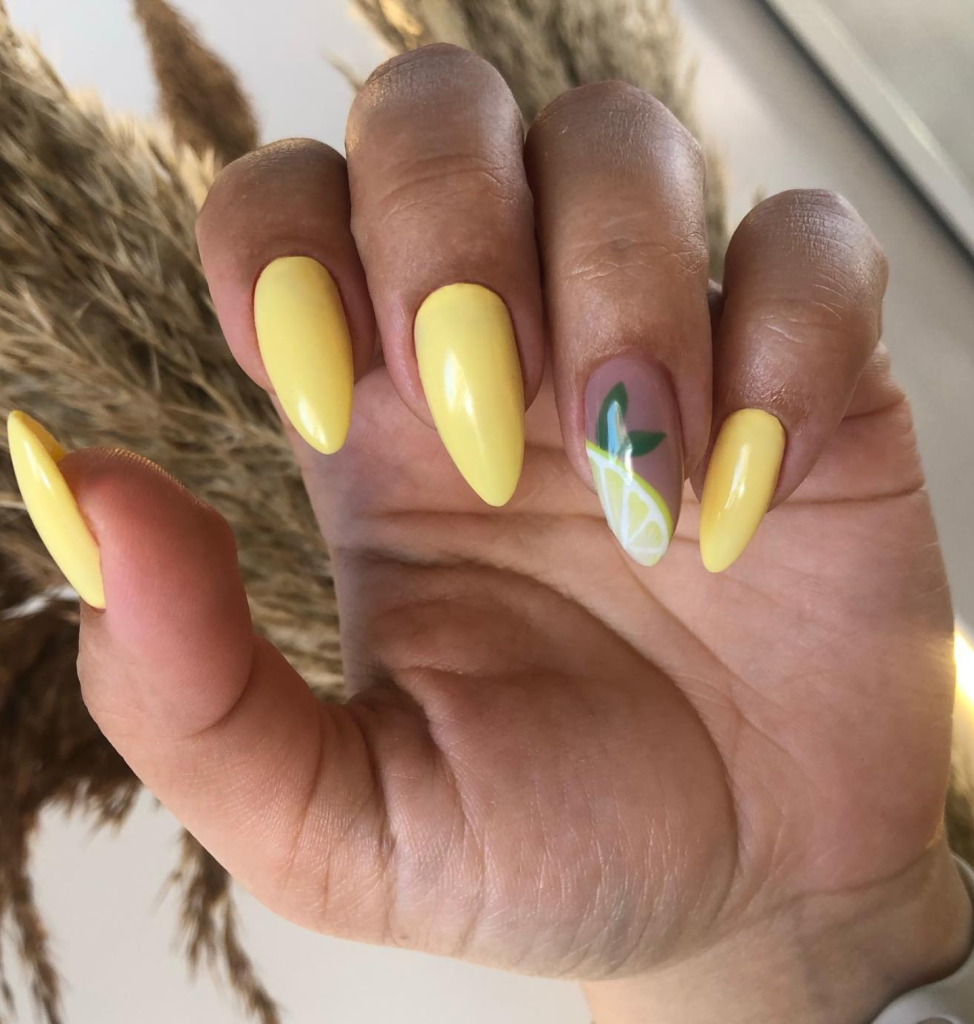 It is sunny days that necessitate nails that are likewise sunny, and this coffin-shaped, lemon-yellow set readily responds to that demand with a lot of spirit. One nail adorned with a citrus slice stands as a tribute to the minimalist design with a sprinkle of playfulness. The set is indeed an ideal design for the slow summer days of sipping lemonade beneath a clear blue sky.