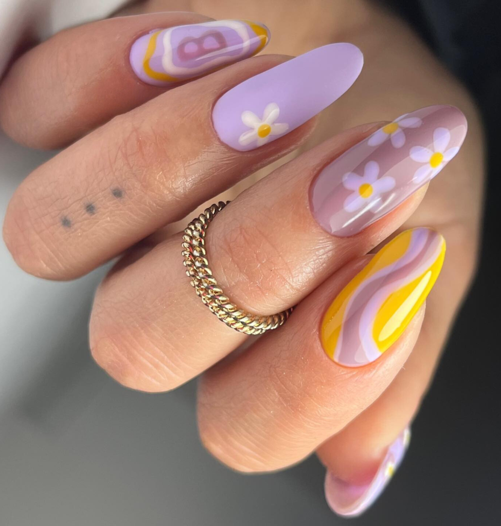 Daisies which are the primary motifs along with passive shades of lavender give the nails a flowery effect. The shades come together in a simplistic yet sophisticated design where the sporadic burst of yellow introduces joy in a design that is largely neutral. It is a norm for nails to be in their natural state but such a style can suit both a garden party and a rustic escape trip equally.