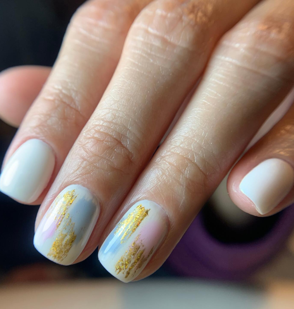 The tranquility of the sea has the charm of gold in this internal and at the same time simple design. These nails, adorned with the delicate touch of gold on a canvas of soft white and blue, are the ultimate summer accessory.