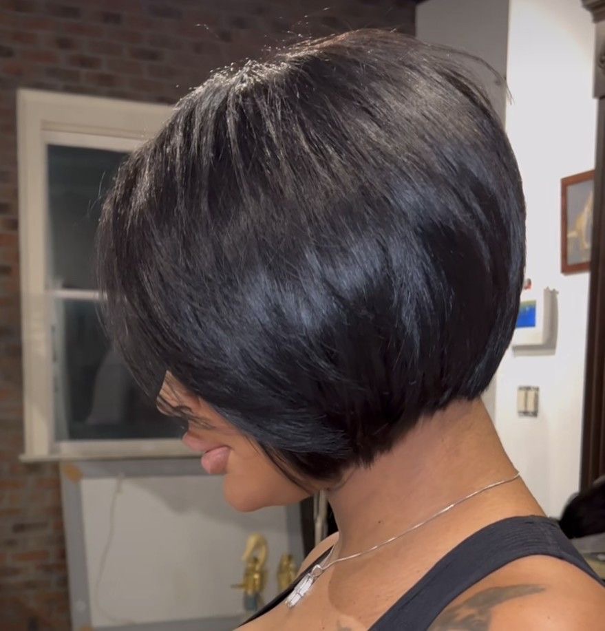 This hairstyle is the top excellence of this cut, which is applied in a way that makes the hair appear feathered. Visually, the existence of each hair strand looks capable of taking off from its singular being and dissolving into the whole style that is bright and active. This type of bob is the best choice for those women who wish to achieve a voluminous and full appearance on their hair, plus, they are in a quest for a cut that will not only produce but also add a touch of its own design and a natural look.