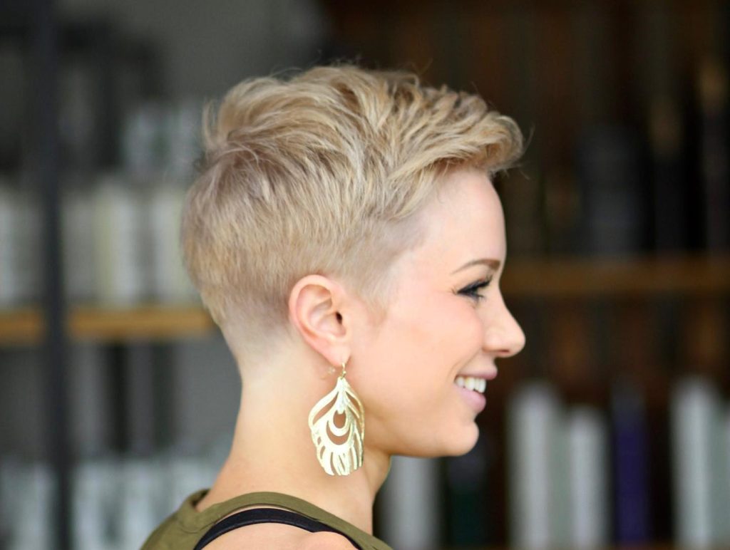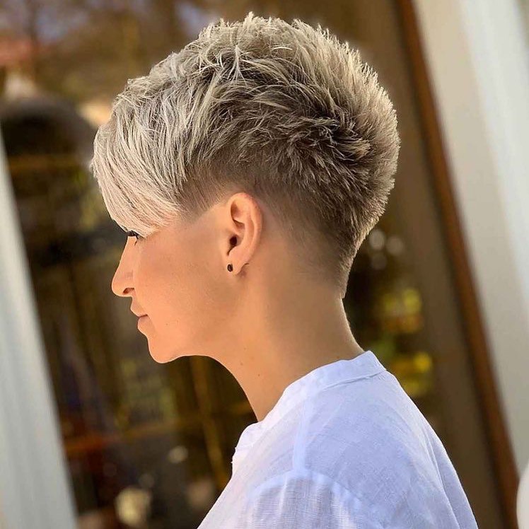 Chic and imaginative, this haircut with its underneath deconstruction and arrange top layer is a masterpiece. The difference between the shaved sides and the large top part makes a very fine profile that is both fashionable and aristocratic. This hairstyle is a symbol of the new epoch, designed for a trendsetter lady who is fond of breaking the rules of the classic short cut for spring.