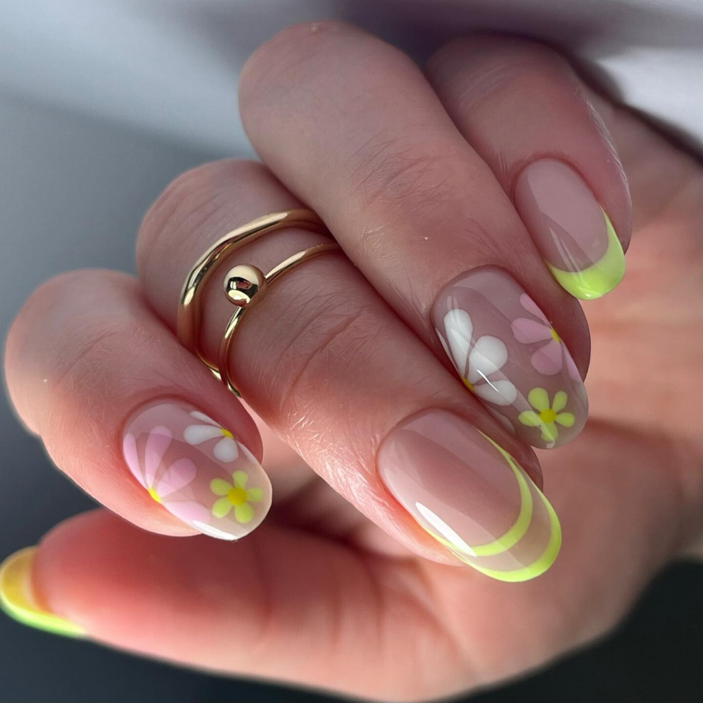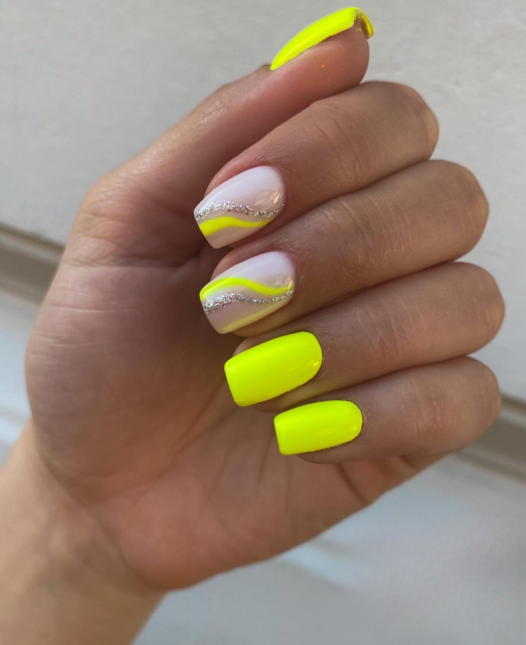 Neon has made a glorious comeback, and now its brightness is unmatched. The second model presents cheerful neon yellow tips descending into a transparent base, highlighted by sinuous white flowers. This is a design which is refreshing and flirty, with the whole concept summer at its best. Carrying such an artistic touch, this piece is more than a trending design; it is a piece of art.