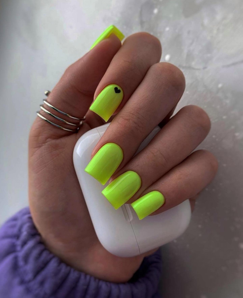 Electric lime nails are the best choice for people who want to attract attention. These nails are hot, flashy, and hard to overlook, just like the girl who enters a room and instantly claims it. The minute heart detail serves as a distinguishing touch that’s as special as your fingerprint.