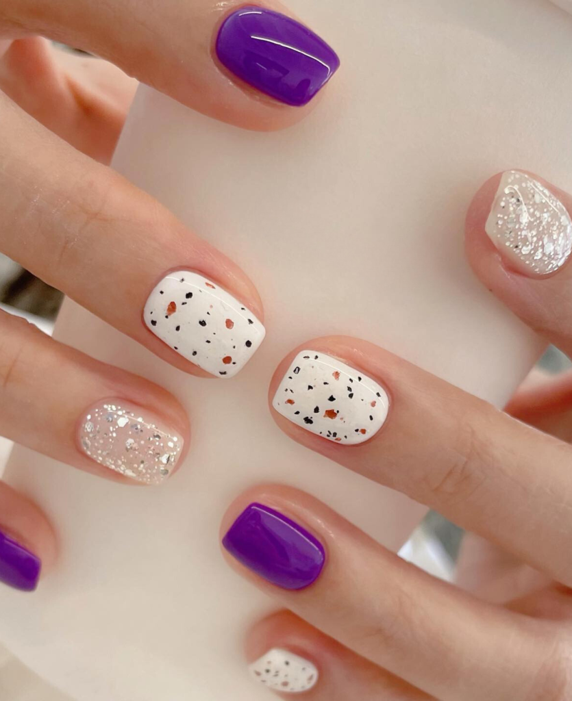 If you are a lover of classic style but still want to have a twist, then these nails are for you. Dotted white polka patterns are combined with a glossy purple color that shows the classic elegance. The design is fun and trendy, a great match for summer trips.