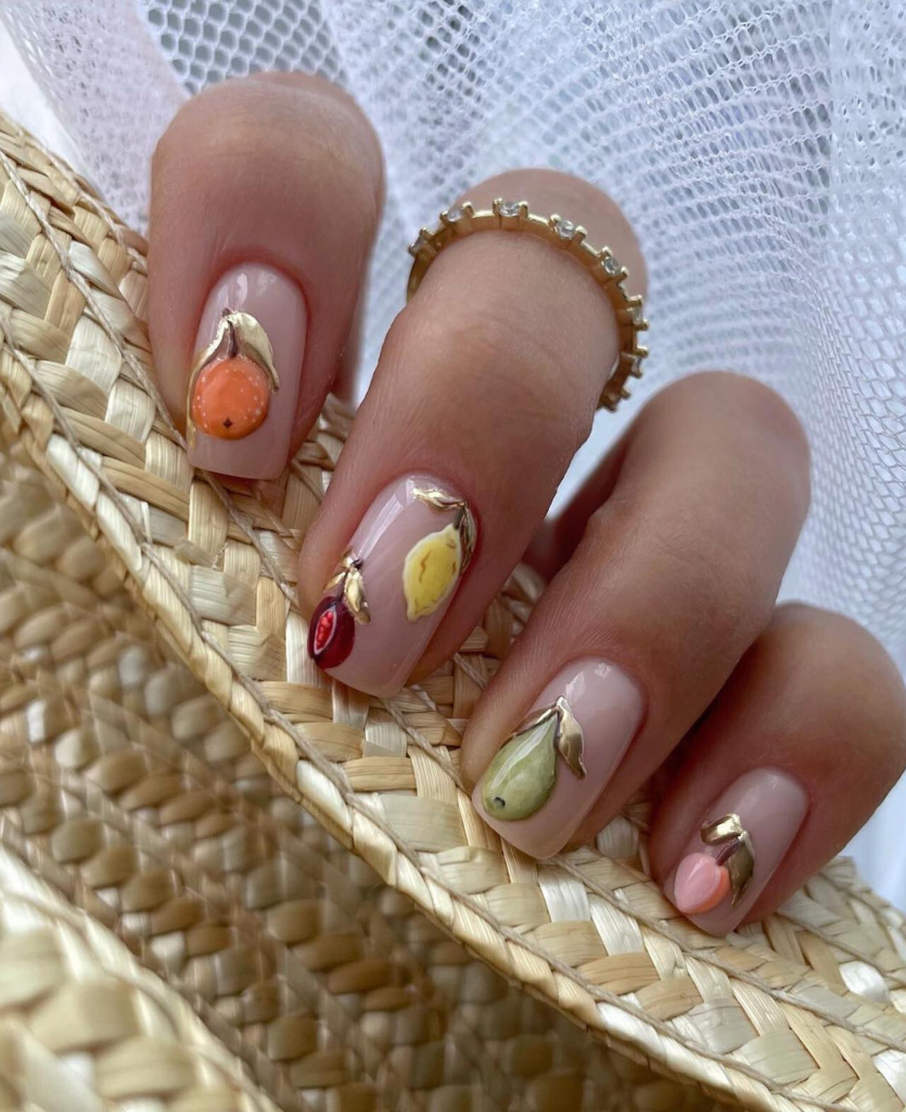 Fruits designs on a dusky pink base are the sunshine bounty of the summer. The beautifully detailed charms make the nails 3D that are the main idea of nail art trends in 2024.