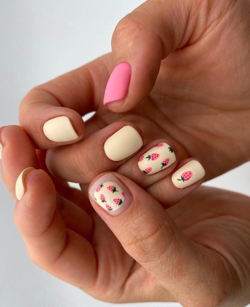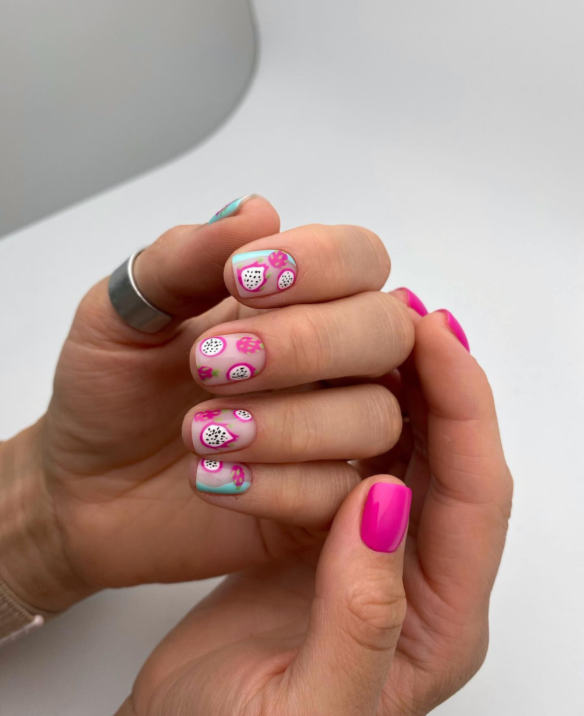 Summer is truly unfinished without the sweet succulent strawberries. These nails are designed with gorgeous strawberry illustrations on a pink and turquoise base, which are the best choice for a trendy and fresh summer style.