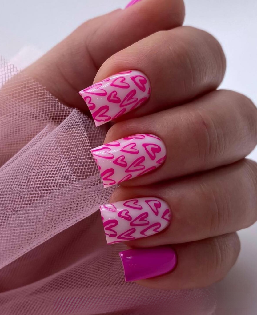 Candy pink nails with an overlay of bubblegum pink hearts create a playful and fun summer vibe. This design is perfect for those who want to add a touch of youthful inspo to their look, a nod to the carefree days of summer love.