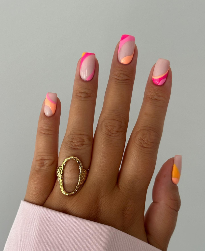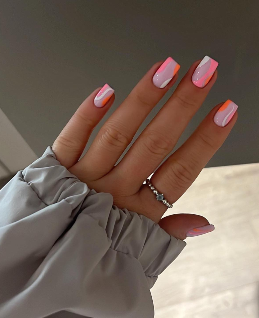 With soft pink and geometrical, sharp angles, geometry is the pilot of this trendy design. It is a fresh version of summer nails, adding a playful and creative touch to your regular pastel colors.
