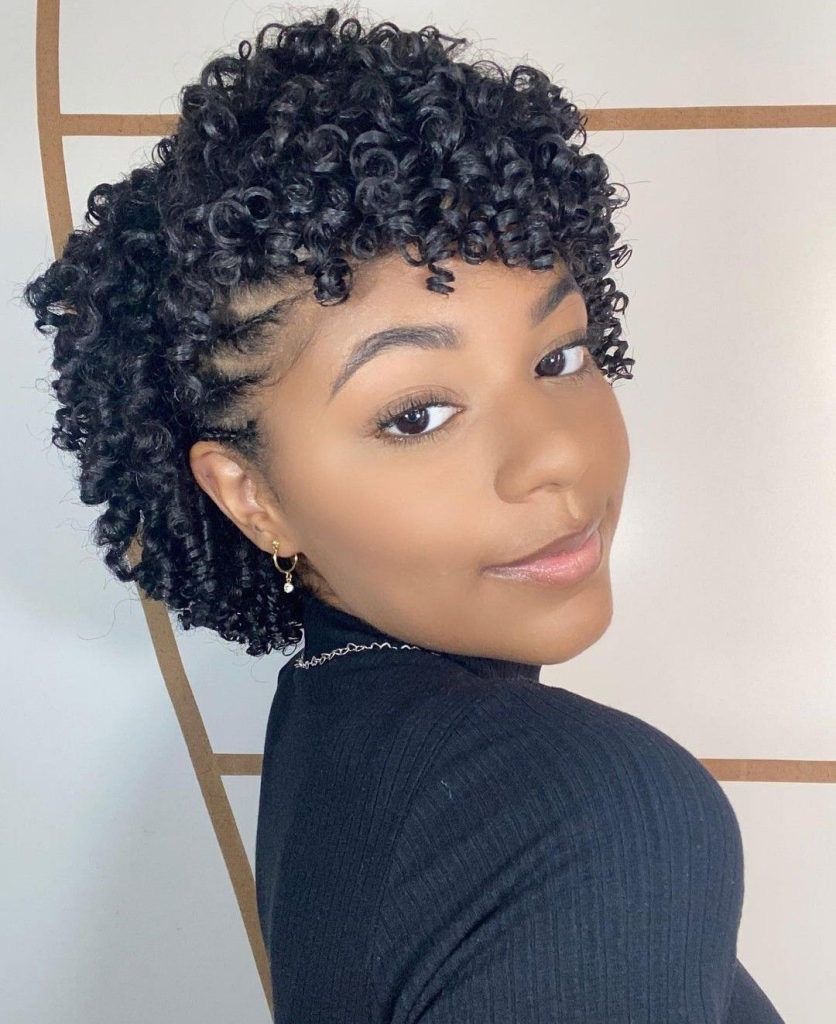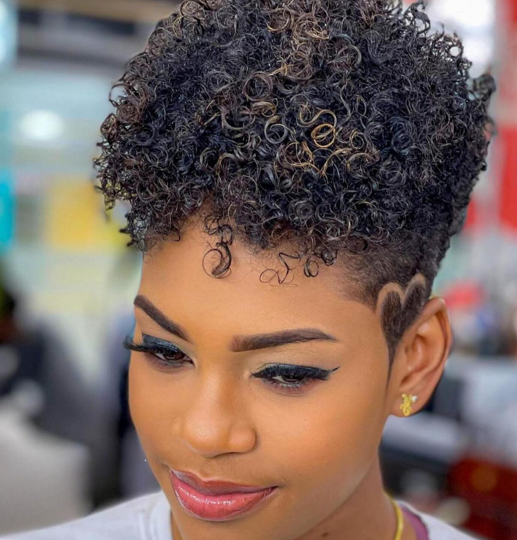 This style is for those who adore pixie cut but with a bit of audacity. The natural curls are left a bit longer on the top side, creating a voluminous and textured look that is both modern and edgy. The sides and back are very closely cropped, which creates a great contrast to the soft curls on top. The style is particularly suitable for women with round faces, as the height on top visually lengthens the face. The black curls give the hair a 3D effect which is what makes the hairstyle special for African American women who choose to go natural. This is an ideal hairstyle for women over 50 who are looking for a simple but very stylish design that is easy to maintain.
