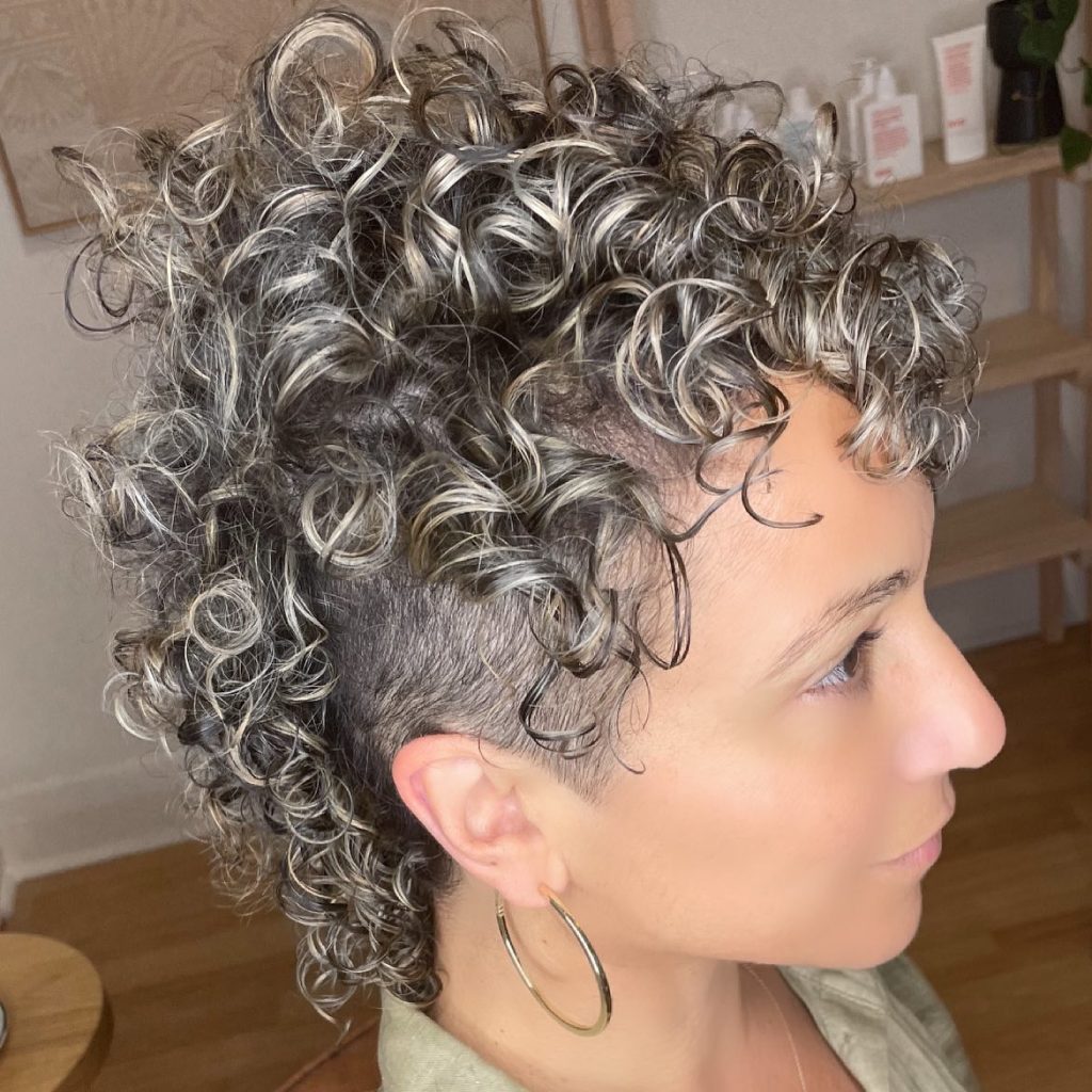 This is a curly pixie very uniquely designed; It has a shaved side design and is an edgier version of the templated style. This is a very bold style that suits people who are forward to fashion and love to style their hair in different ways. The curls are so well-defined thas it is a strong choice for someone who has a natural look with gray hair that is 50% and wants to keep up with the fashion trends.