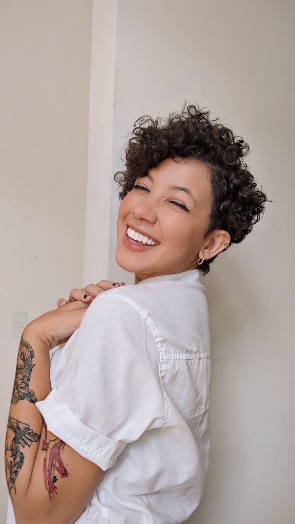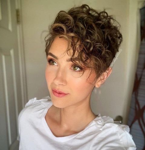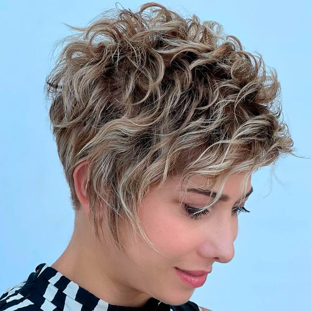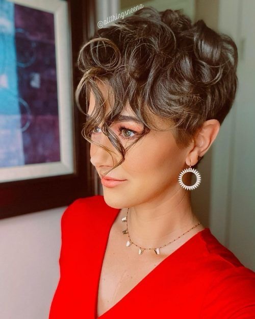 Soft, romantic, and playful, the side-swept hairstyle of this curly pixie cut delivers a whimsical touch. It is an ideal choice for people who want to pin a mischievous twist to their look. The side-swept bangs add a shade of elegance, making it a wonderful option for hairstyles during a wedding or other special occasions. This style is perfect for those with naturally wavy bobs who want to do it differently.
