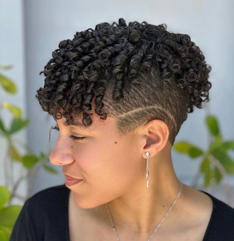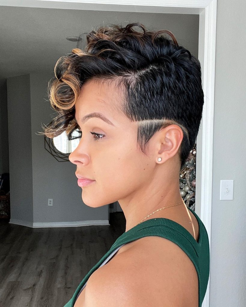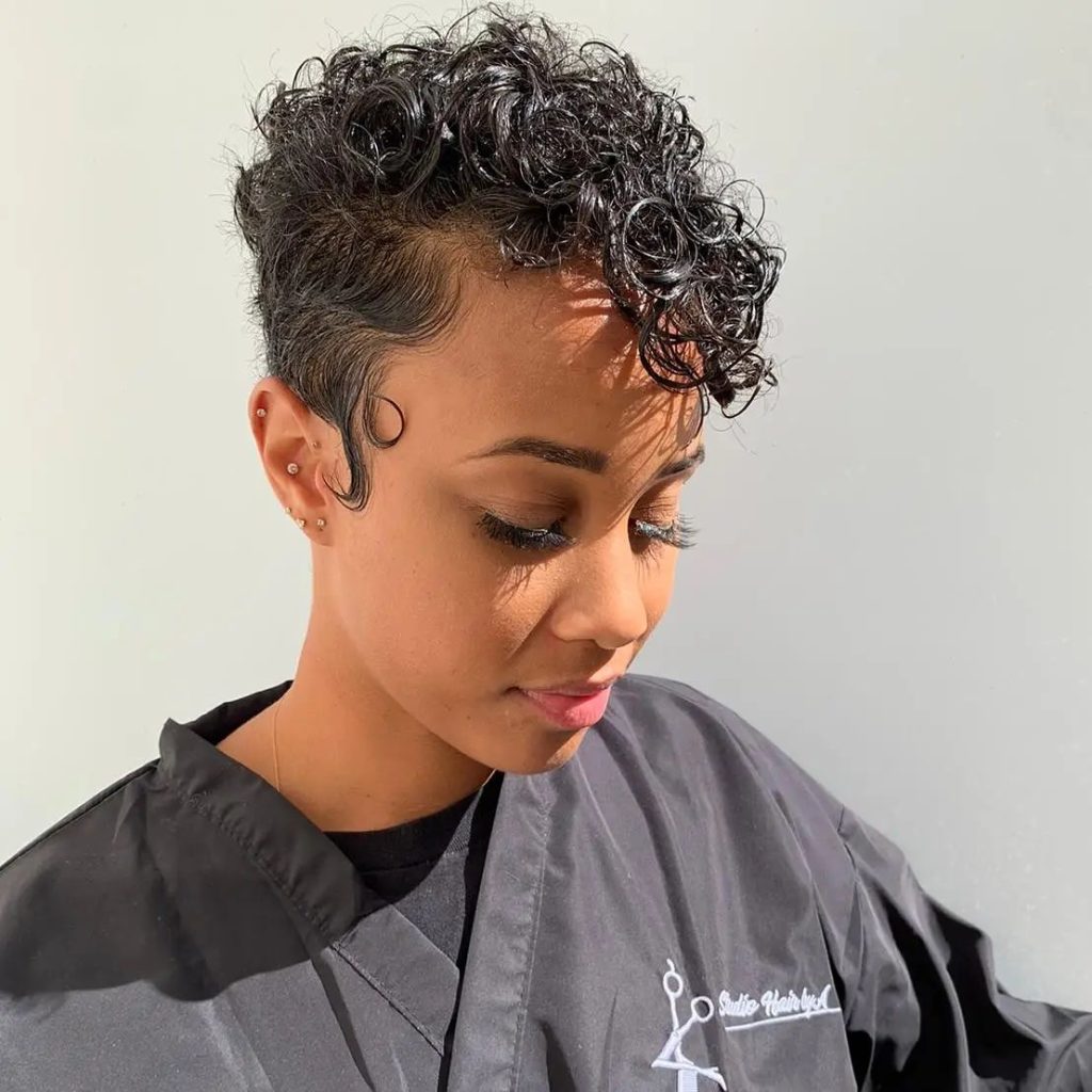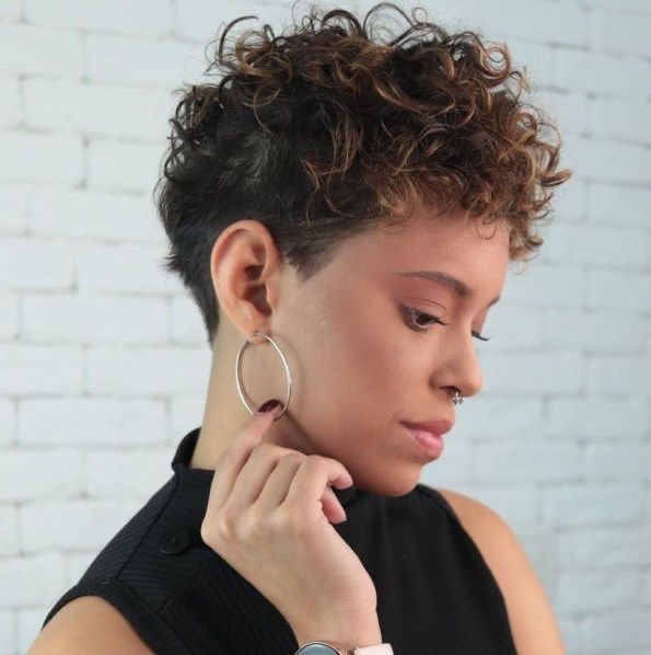 This is a cool and feminine pixie hairstyle with an undercut especially for a fashionista that loves the bold style. An undercut is daring and the curls on top are soft, therefore, the statement is both rebellious and feminine. This hairdo is mostly great for people with black hair as it shows off the natural texture to the fullest and also brings a neutral but cool element to the composition.