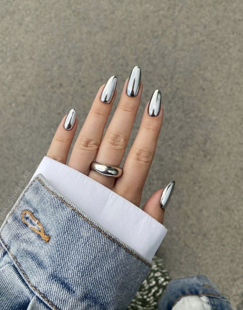 Silver chrome is directly reflected in an almond shape, which is not very much. This is more feminine in shape. The nails give a slightly rough and sexy impression together, thus they are the perfect accessory for a trendy woman who is passing through the urban areas. A metallic surface and casual jeans set up a contrast that is absolutely striking and sophisticated.