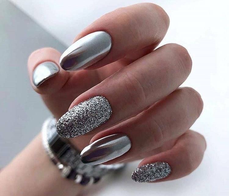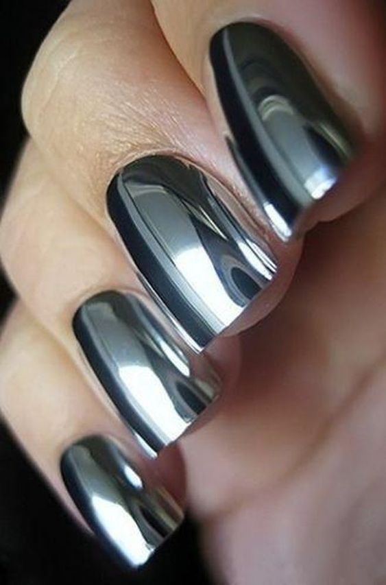 Almond-shaped silver chrome nails generate the perfect definition of gracefulness. They are the true followers of the simple beauty; their narrow shape only emphasizes the natural elegance of the hands. It’s unimaginable that there is any event, such as a wedding, gala, or just a night out, they cannot be the best proof of the endless charm of the almond form. You may try to personalize your metallic surfaces by adding abstracts of blue and silver or using French designs that are very much in vogue now.