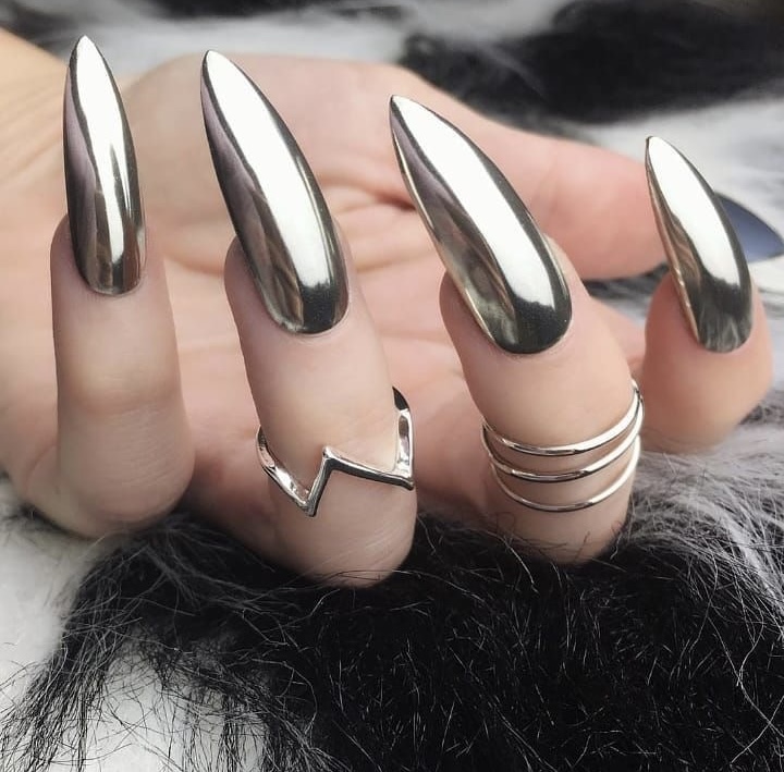 The nails shown in the photo look completely stiletto, i.e., their sharp tips and silver chrome cover are extremely luxurious. The nails shown are a typical example of the wearer’s way of showing their style, and that is why they have been matching with hip-going parties or night outs.