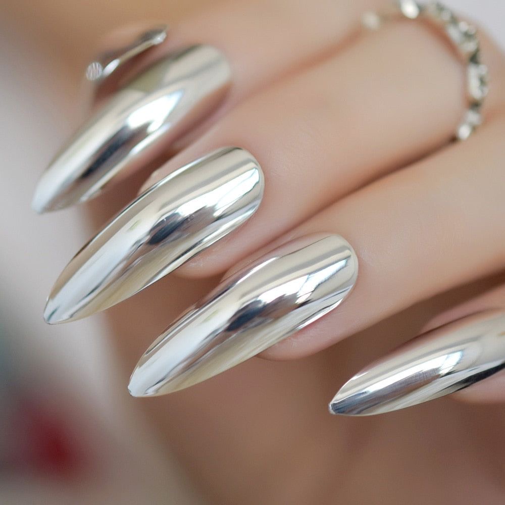 The next stop on our journey is the stiletto design, which is characterized by its pointy nails, and is a miraculous view of a silver shiny chrome wrapped layer. This model illustrates the style of being a pioneer, temporally looking to the future and yet full of a classic style.