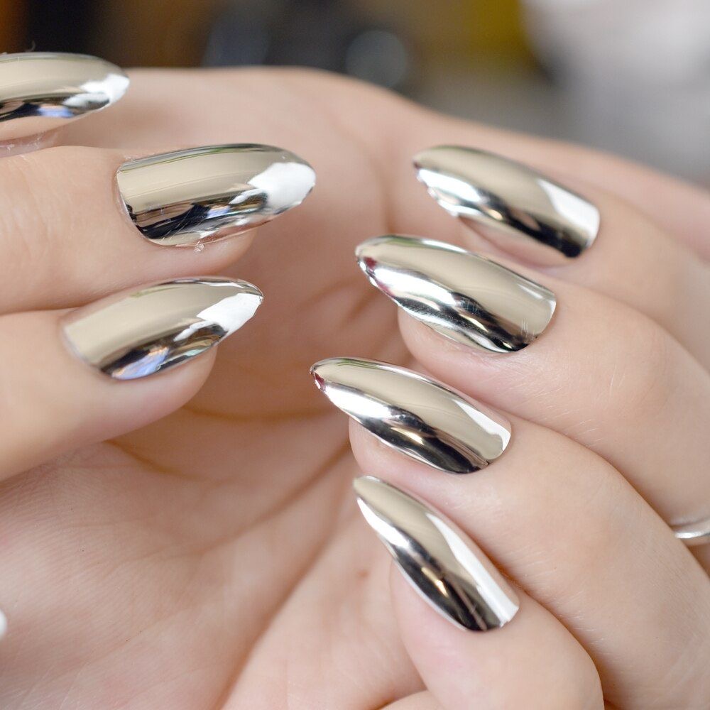 Imagine your nails as not ordinary nails, but as a type of a canvas. Instead of a white canvas, think of a shiny body that can fully reflect. This style is a regular almond shape but it becomes metallic, which is both sleek and reflective. It is an excellent option for brave people who like to be the center of attention. Such nails are the modern version of the classic style. They can be worn by themselves or they can be used as a canvas for the special design such as with rhinestones or with charms.