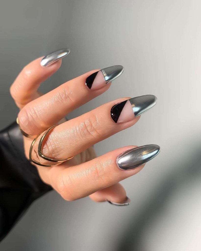 This almond-shaped already design for nails is a new gem for the perfect use of graphic lines in the way these lines contrast with the base in silver chrome. The design is the modern version of the old one, which brings an air of mystery and individuality to it. It is a scheme that not only reflects precision but also flaunts it, which is perfect for a lady who is magnetic, charming, and knows how to express herself strongly with the details of the composition.