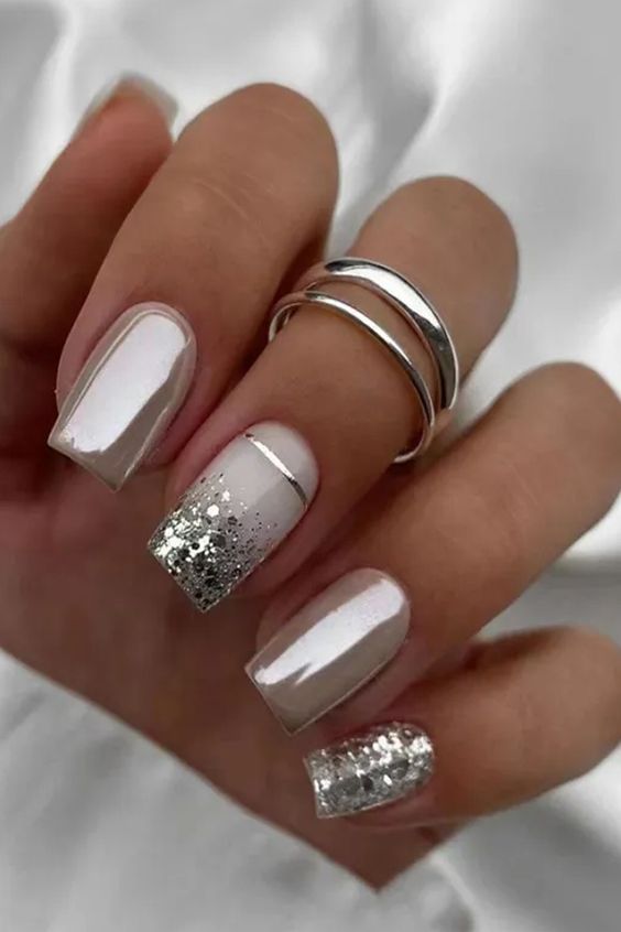 28. Chrome with Glitter Accents: A French-Inspired Twist