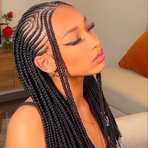 This chic hairstyle is highlighted with long black braided strands that are soft waves hanging down from the ends. The braids are neatly divided and are ornamented with smooth and delicate edges that outline the face, thus emphasizing the person’s beauty. This style is favorable for women with African American hair types who are looking for a trendy protective kind of hair that can be worn on several occasions. The curls that are not sick leathery tips at the end introduce a Bohemian touch to the hairstyle, which makes it suitable for anyone who wants to protect their hair while remaining romantic and liberated.