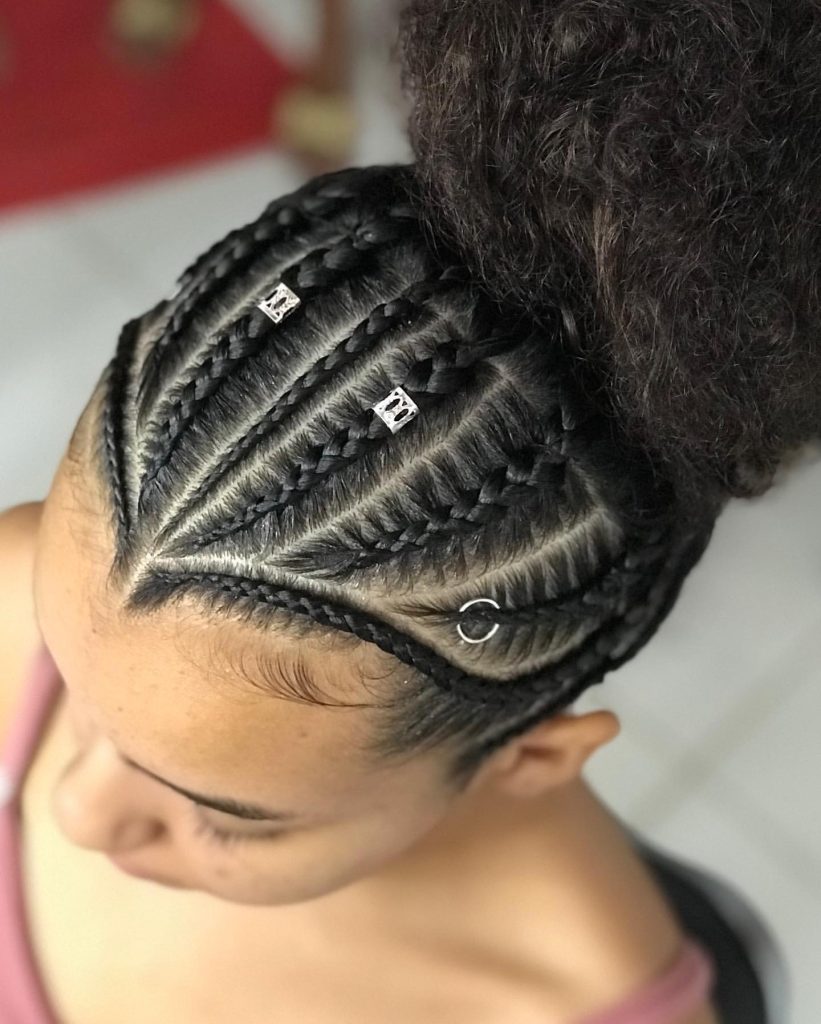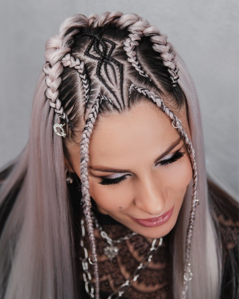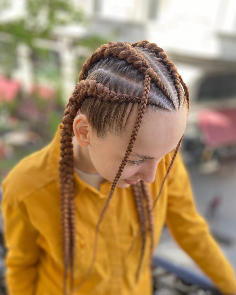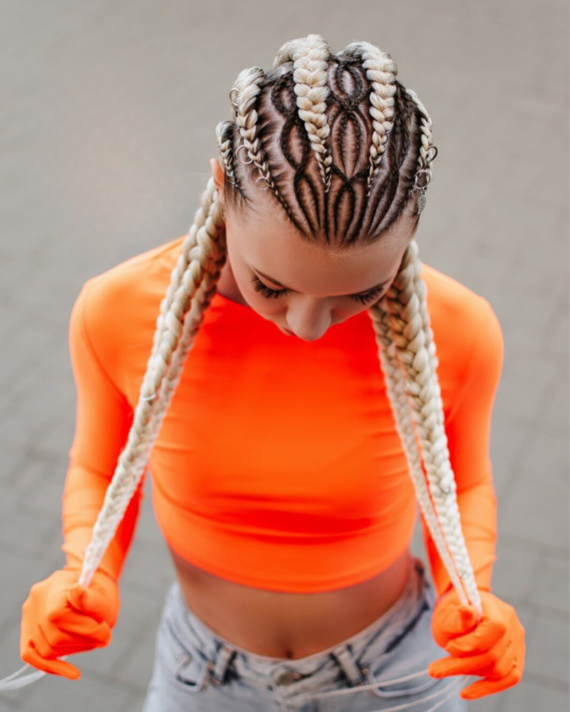 This particular hairstyle, along with the unique patterns and shapes that it features, is a perfect example of a new approach to braiding that is at the forefront of hair fashion. Instead of simply being straight lines, the braids serve as elements of an intricate, more complex design that symbolizes the wearers’ contemporary and active life.