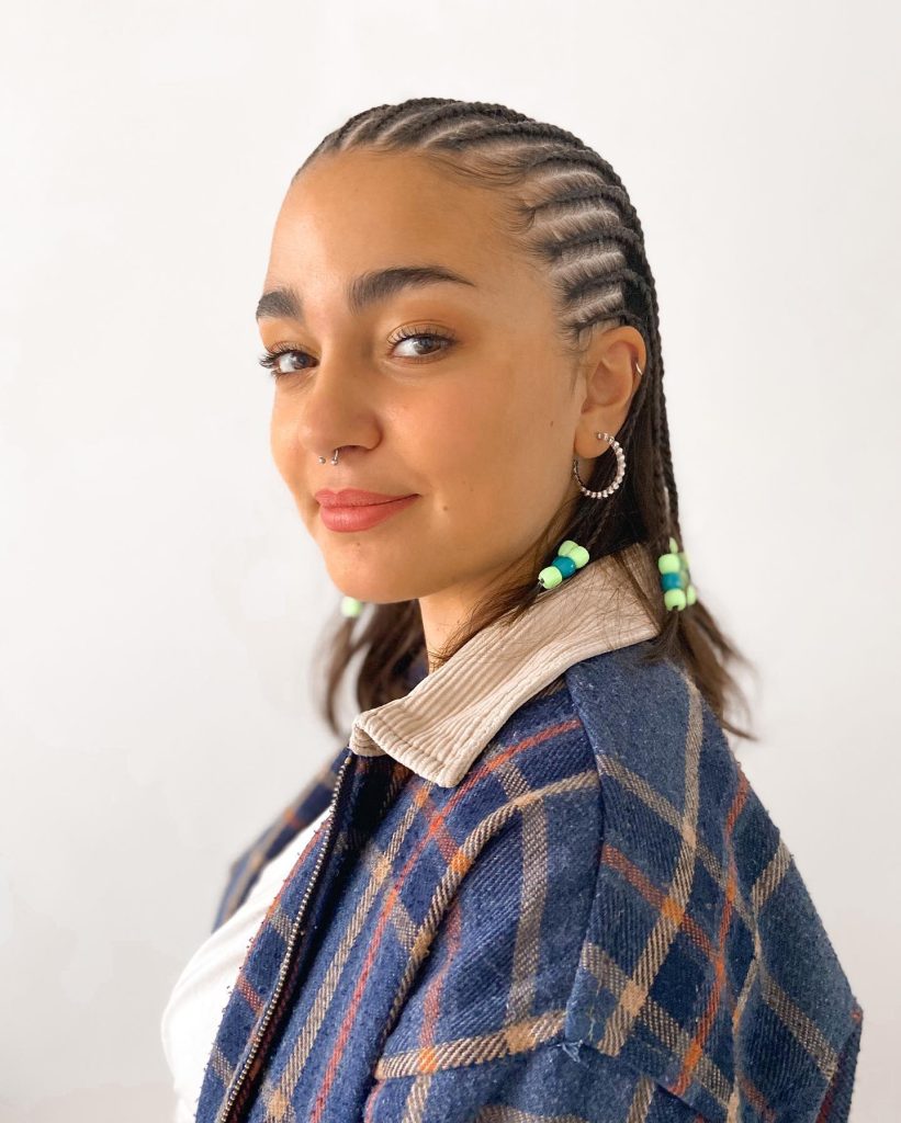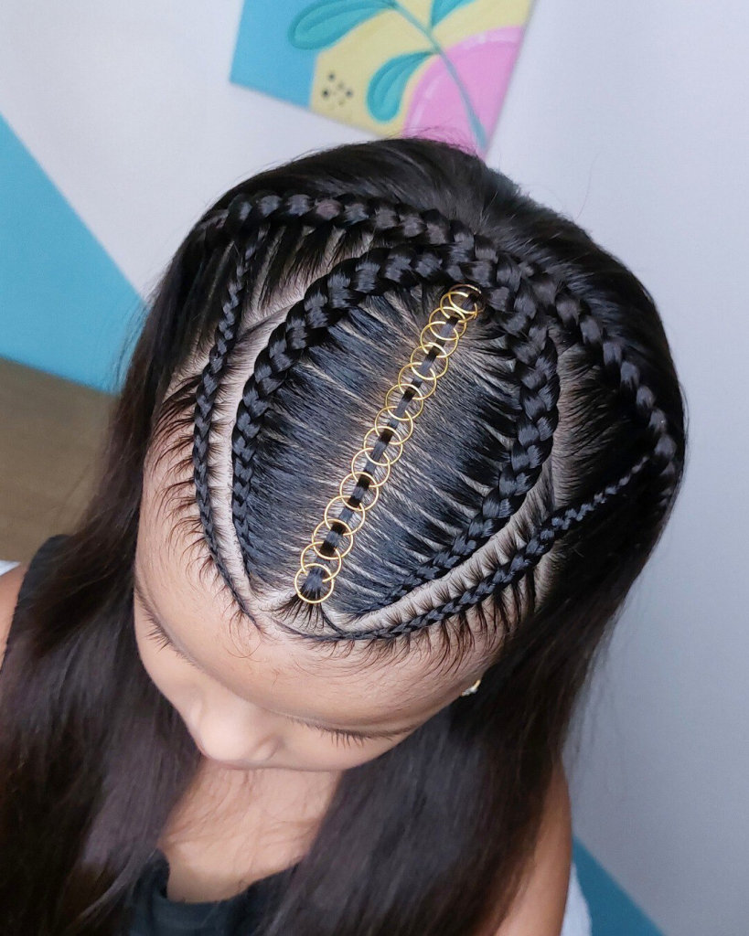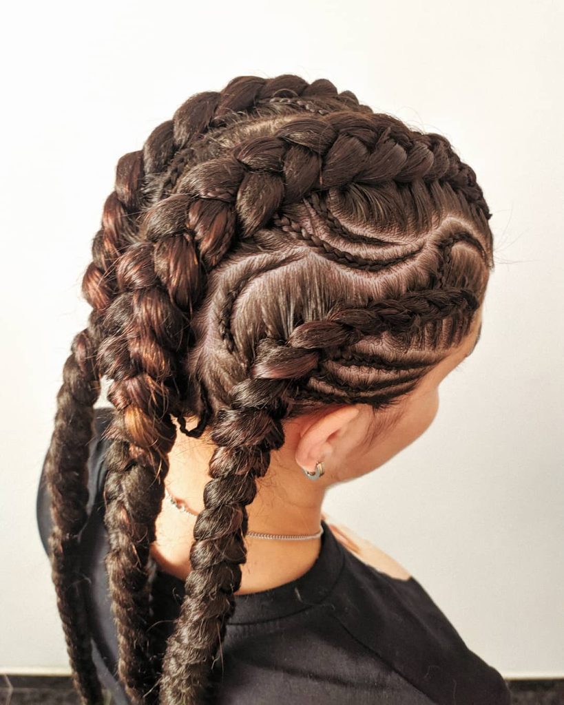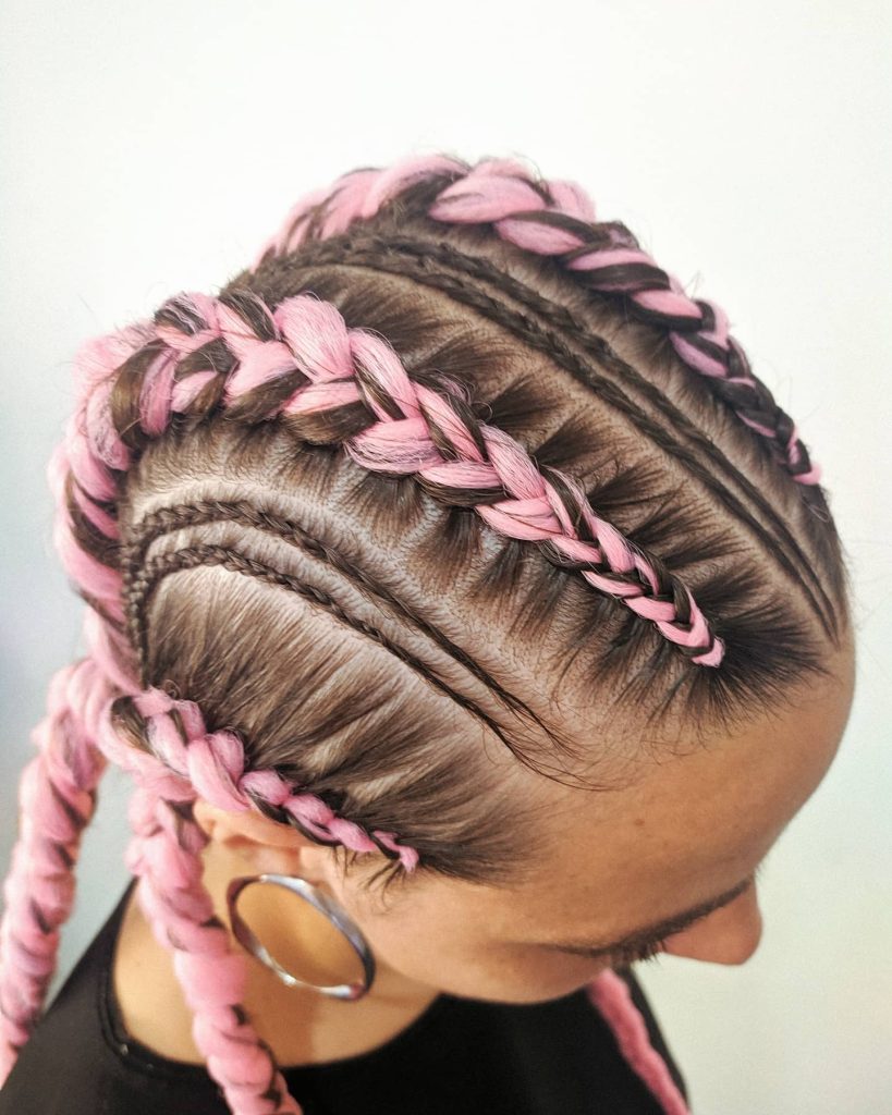 This particular hairstyle, along with the unique patterns and shapes that it features, is a perfect example of a new approach to braiding that is at the forefront of hair fashion. Instead of simply being straight lines, the braids serve as elements of an intricate, more complex design that symbolizes the wearers’ contemporary and active life.