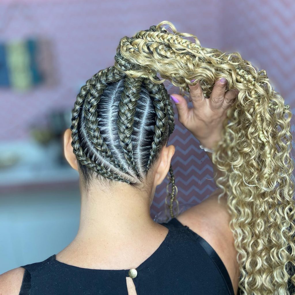 This hairstyle which is a fusion of very neat cornrows and huge curls, is a real eye-catcher. The opposition of styles to each other is an honorary tribute to the diversity in hair styling, giving a base that protects it with the freedom of flowing curls that move and enliven the look.