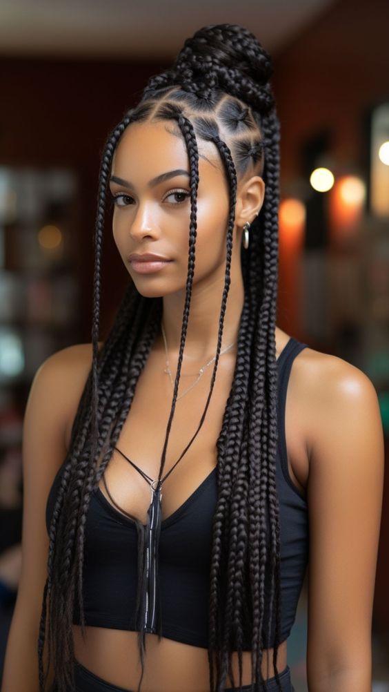What we have here is a very superb illustration that combines playfulness and practicality. The hair braids are twisted into a high top knot. This particular hairstyle has the great feature of both making the hair not touch the face and also making it very secure. But besides these benefits, it has the added advantage of being fun to wear. Therefore it is now among the best hairstyles for 2024 outdoor casual and hippie fashion.
