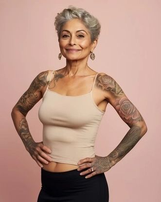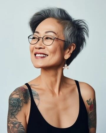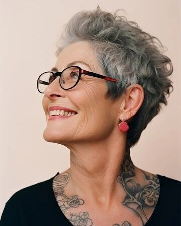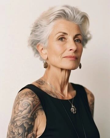 The photograph presents a calm and dignified expression with a mid-length cut, which is the measure of sophistication and style. The gray hair, styled in soft waves, gives a look that is both modern and classic at the same time. The tattoos on the person combine with the hair in an unusual way, they speak of the body’s art, and tell about a rich life and a soul that is full of experiences. This hair style is perfect for those with thick hair, it creates a sense of form and adds volume of hair without losing its natural body.