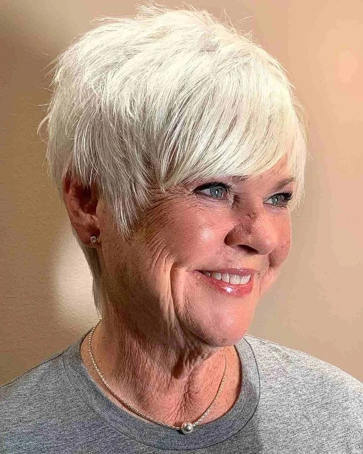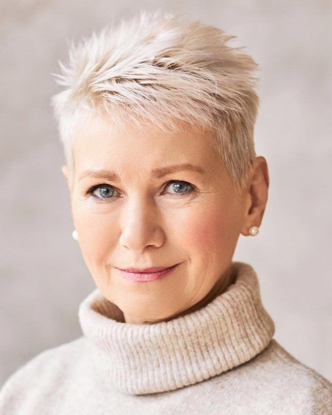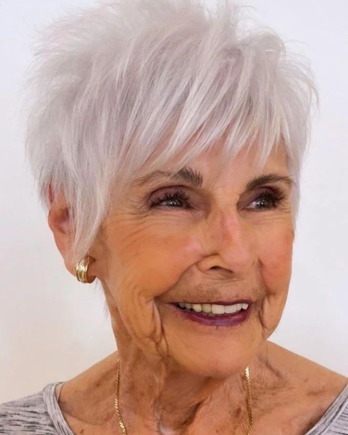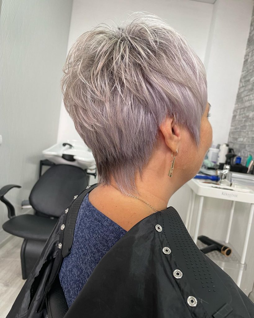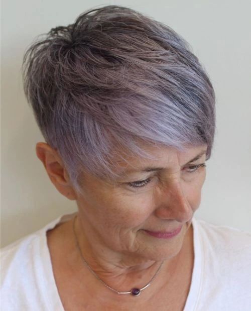 With this lovely pixie cut, you may easily join the league of platinum lovers. The hair appears like soft feathers, blending the elements of lightness and elegance of the style together beautifully. The natural grace of gray hair is nicely stressed by gentle, airy layers that give it a delicate but effective texture. The minimalist jewelry that you wear with this look would be perfect to highlight a classy and elegant touch.