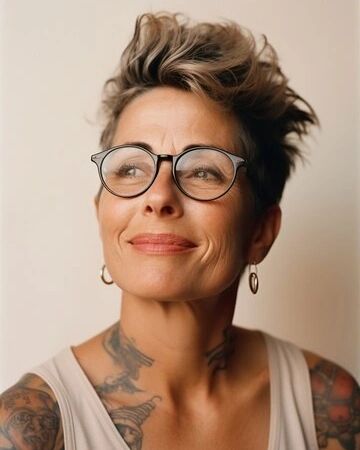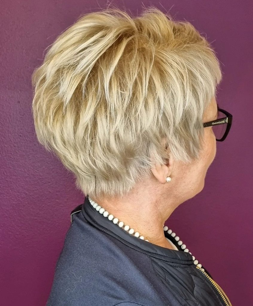 Bringing the vibe of being cool, this haircut is for everyone, no matter the age, and it is just a plain straight pixie which has a fun lift at the crown. It is made of fine texture, so the hair is both soft and structured which gives an easy look and is also stylish. The glasses worn by the model give a smart difference to the spiky top, and that is to say that glasses layered bobs can be seen in innovative and youthful versions.