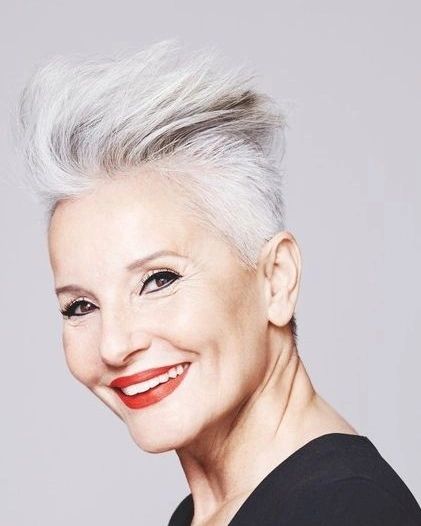 Contrary to the timeless and stable greys and whites, this pixie haircut has a striking auburn color. It is a daring choice for those who are living by the sword and the fire. Due to the simple bob cut, it becomes easier to create more volume for straight hair types. The lipstick which is very bright has the same hue as the hair thus forming a harmonious and dynamic look.