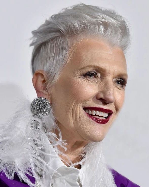This hairstyle embodies confidence and is characterized by a spiky top that injects a rebellious spirit into the overall silver fox look. The slick hair is masterfully combined to bring in a cheerful yet formal appearance. The bright orange lipstick is a clear indication of her side of the issue boldly, with it being an ideal partner to the lively atmosphere of the style.