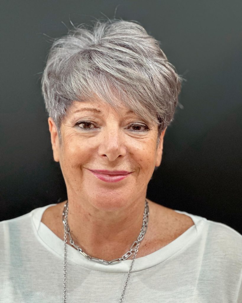 This haircut is perfect for those who want a look that combines style and modernity. The salt-and-pepper gray hair takes the classic shape with a modern tousled finish, which is right for people with thick wavy hair. It is a symbol of eternal charm, for women who are into a style that is both elegant and practical.