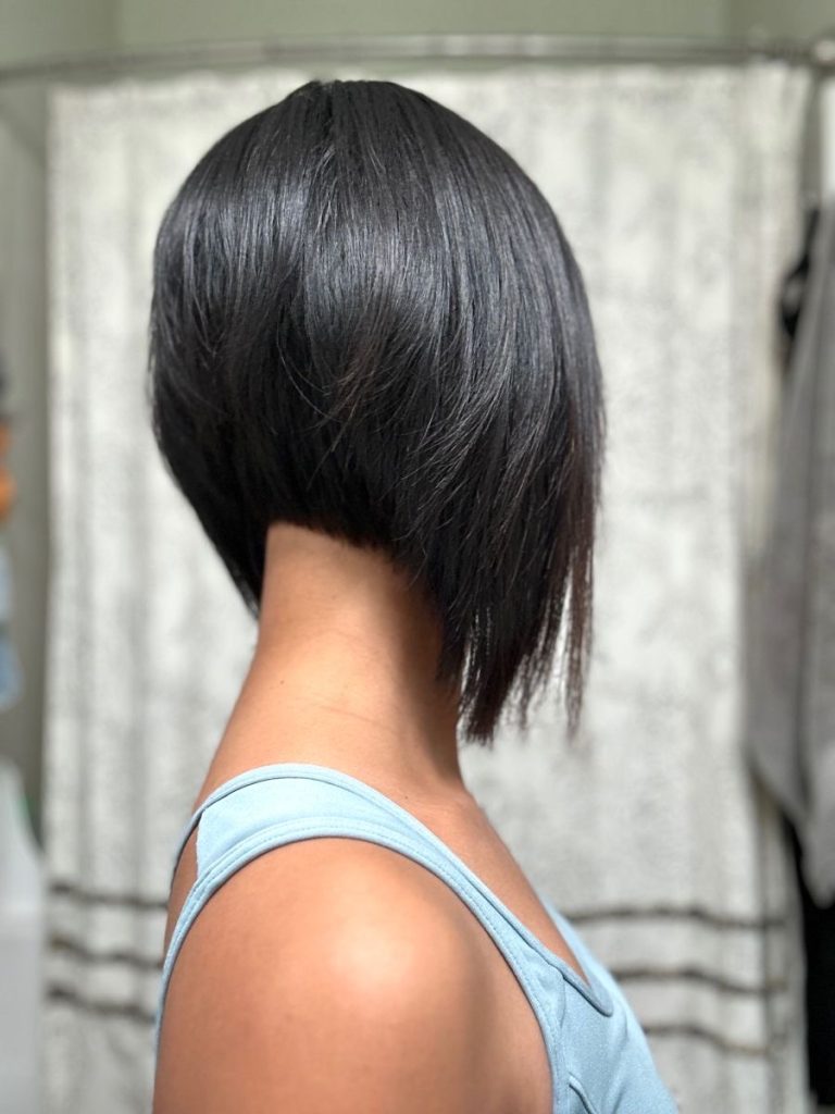 The hairstyle is made of a combination of a thick and slightly understated bold statement of chicness showing the ultimate of the short back area and a luxurious long front. Women in their 40s who want to wear a bob that is both functional and fashionable with almost no effort to go from day to night can try it. Because the layers fall down giving it movement, it is a good option for women over fifty who want to have volume but do not want the extra weight.