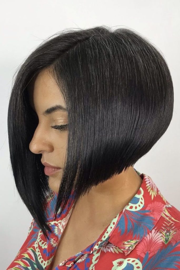 The bob seen here is an attractive and simple hairstyle implying it is a contemporary must-have. The straight, angular lines and gloss of the cut are sufficient to it is a typical choice for women who see themselves as having a neat and elegant look. In particular, it is for the woman with thick hair, which transforms the style into a dramatic yet look both modern and classic at the same time.