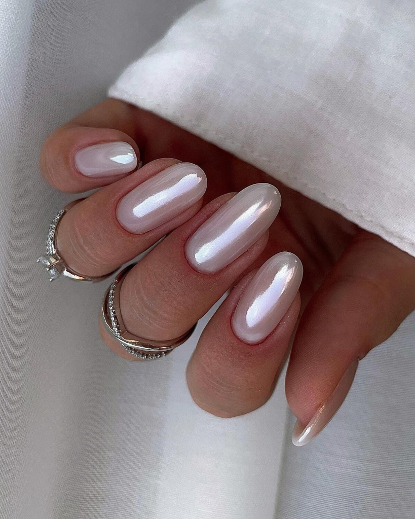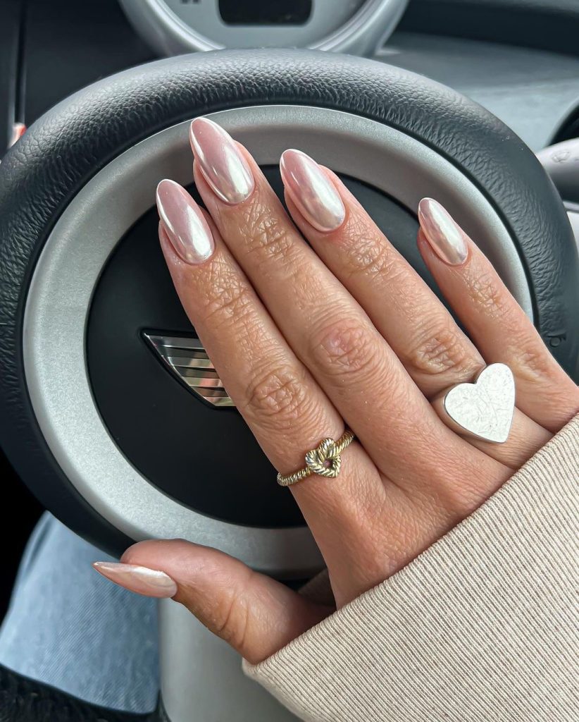 Coated in a subtle pink, these oval nails are an ode to femininity with a minimalistic color. The slight chrome effect which is barely visible reflects the light, creating the fact of magic with every move of the hand. This design is unisex and easily goes from daytime to the evening outfit. It is a style that can be complemented well with delicate fabrics like silk and satin as it can with casual jeans, thus, it is a stylish option without boundaries.