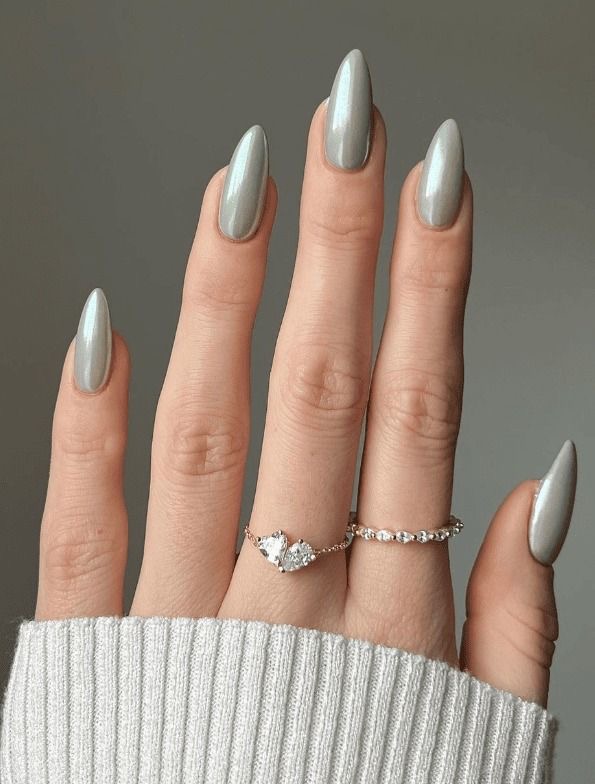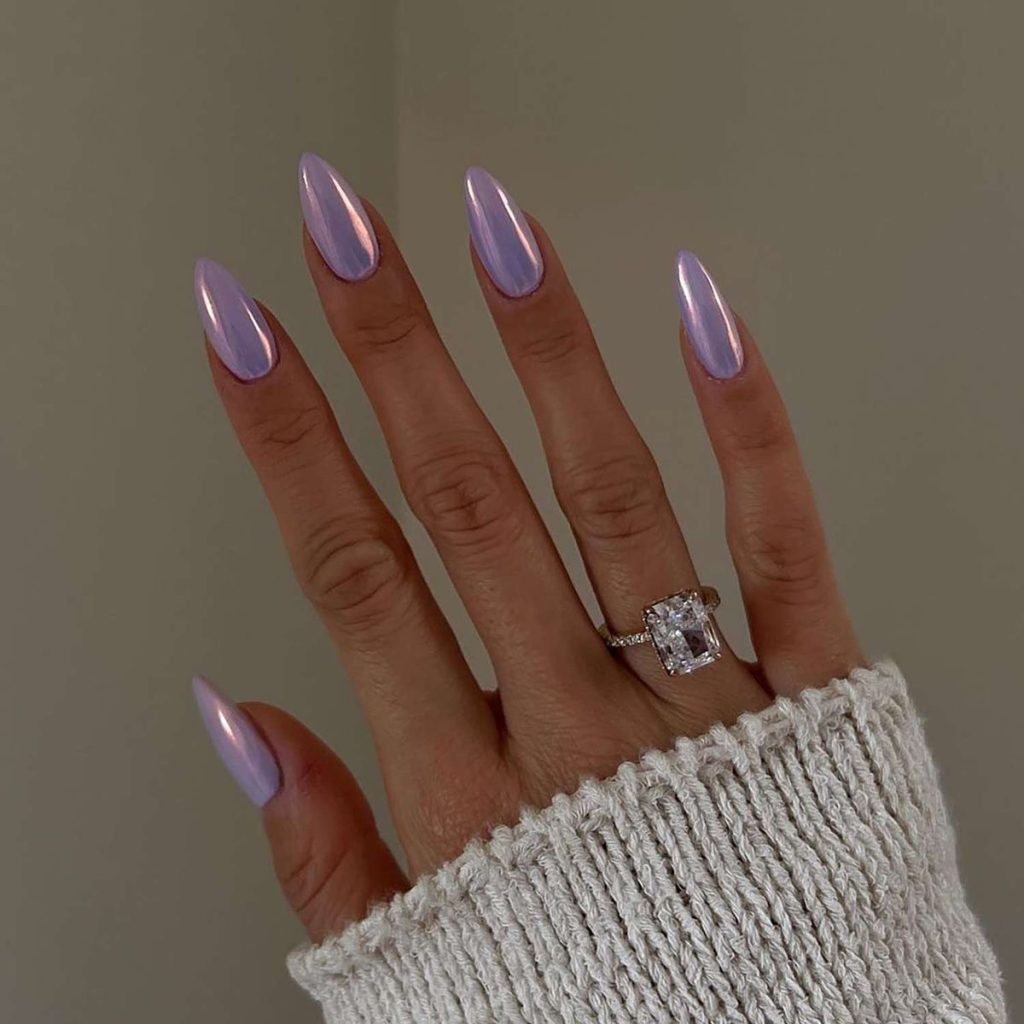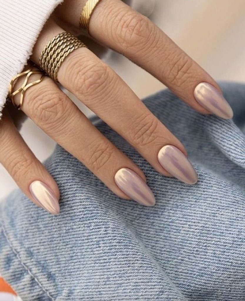 Almond nails feature silken chrome polish on them that perfectly depicts the evening elegance. The soft sheen of the nails is similar to the moonlight, and they can be worn at night events or a sophisticated dinner party. This is the style that embodies elegance and self-control.