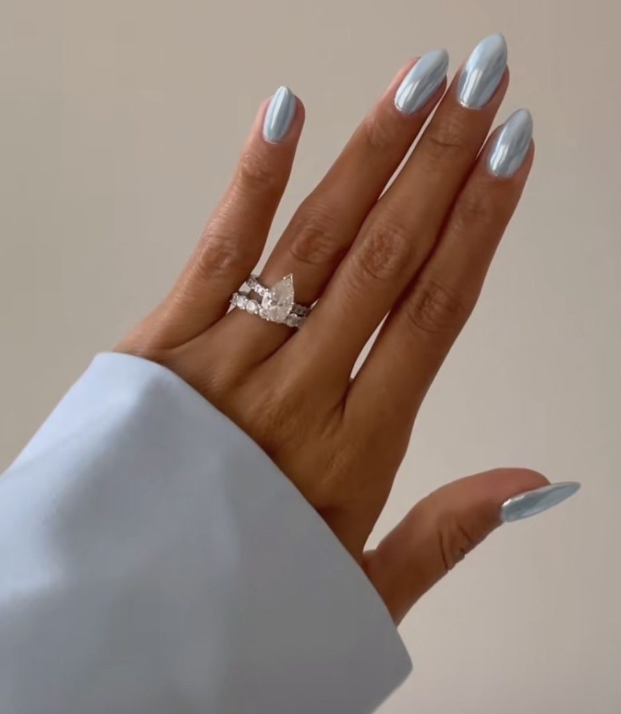 Almond-shaped nails lacquered in a glossy white chrome are an example of advanced and futuristic aesthetics. The long shape is a sign of sophistication and thus is perfect for a person who is minimalist but stylish. Such a design was born thanks to the creative mind of Hailey Bieber—a combination of the latest fashions with old-world charm. They could have been created for an authentic daring personality, with their shiny surface being representative of the highest quality.