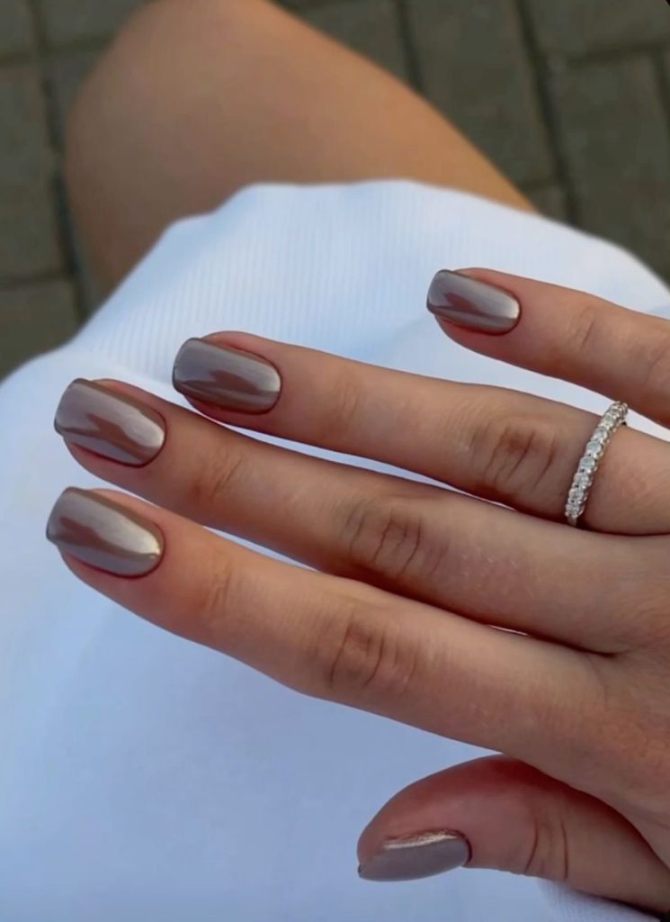 The picture showcases a stunning almond-shaped nails that are covered in a shiny taupe chrome, which displays a modern elegance. This design is suitable for a woman walking with confidence with her nails being a visible complement to her straight, modern wardrobe.