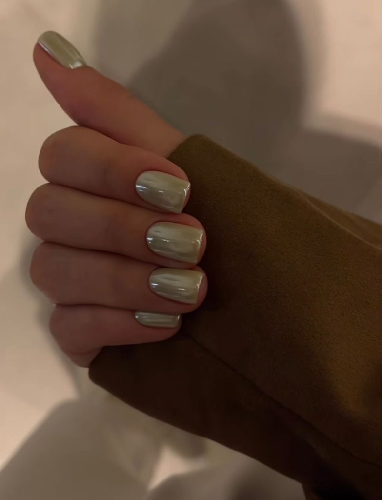A pair of hands presenting a modern look with short square nails painted in shiny chrome that captures the city’s dynamic rhythm. It is the style of the woman who combines high-speed life in the city with fancy minimalism.