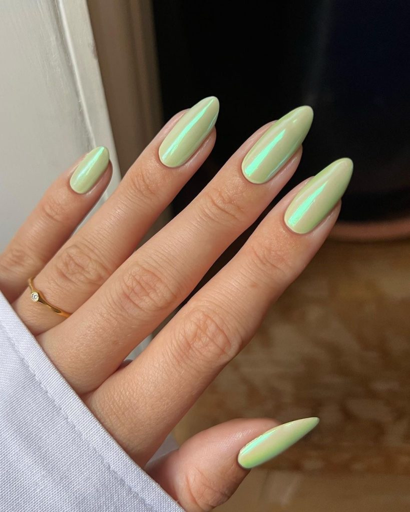 These almond-shaped nails are a new stylish interpretation of the chrome trend and are adorned with a spring green chrome, which is the color of renewal and liveliness. They are a perfect match for a nature-themed refreshing day out or an active entertaining program, which they represent the new energy of the spring season.