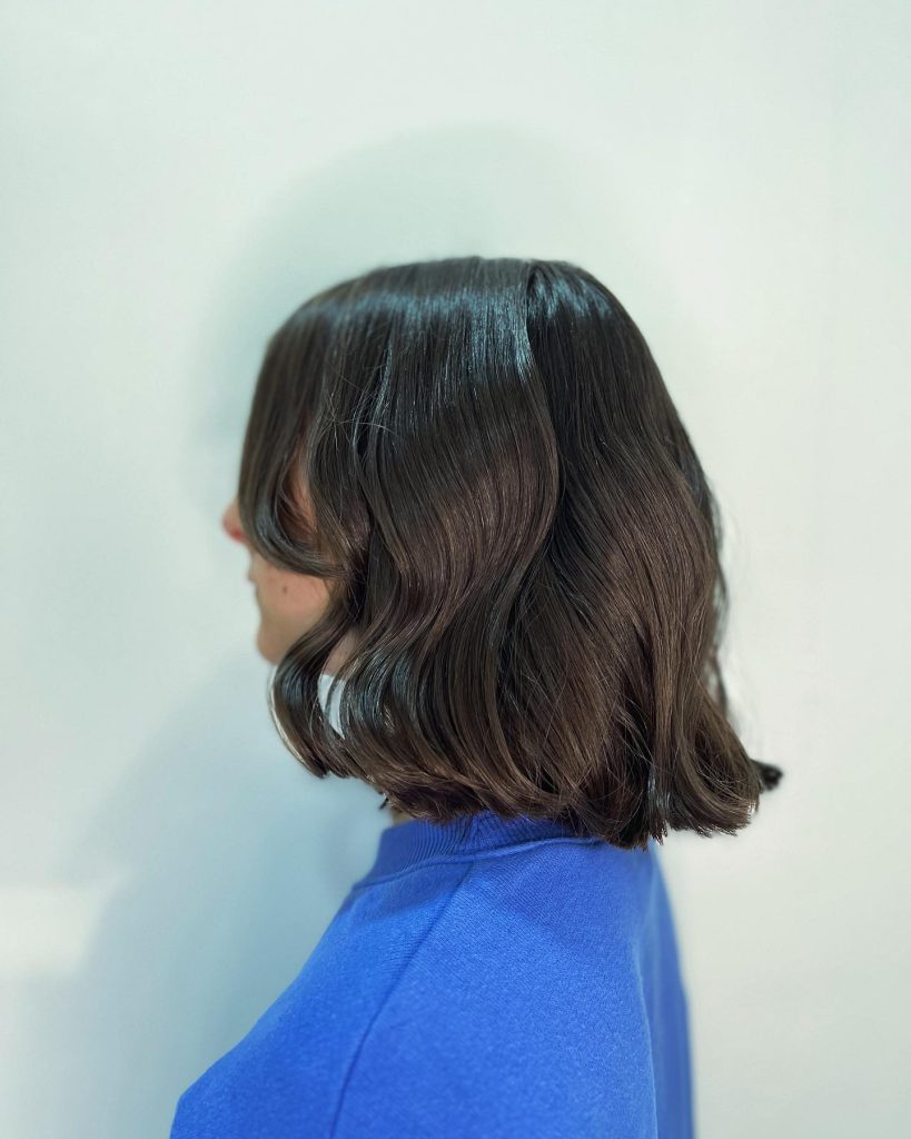We are focusing on an elegant mid-length bob that has been redefined with soft, playful waves giving it extra texture and movement. The deep brown color is flexible and fits diverse skin tones and is especially recommended for women in their 40s. This style is the perfect mix of short hair that is easy to manage and the charm of women with curls.