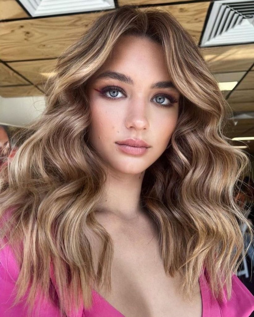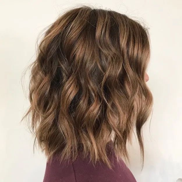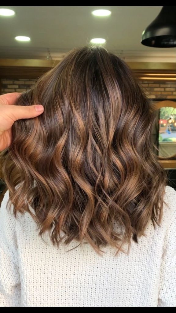 Mid-length hair is the best way to show the beauty of highlighted waves which gives you a three-dimensional look that grabs the light and brings life to the hair. The mixture of brown and lighter colors presents a rich and dynamic visual texture. The hairstyle is perfect for women who want to make a bright enhancement to their appearance without the need to change completely the hair color.
