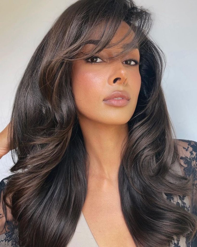These long, luxurious, and beautiful waves have rich brown chocolate tones that are absolutely not less than luxurious . This haircut presents color depth that makes the skin look warmer, and the waves bring an exquisite touch that is suitable for all events. This is a classic style, which, of course, is wanted by women over 50, and it is a very good example that being classy and attractive is not subject to time.