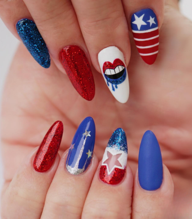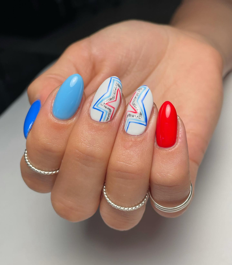 Nails that shine like stars should be celebrated on the 4th of July. This concept combines a blue and red gradient with a little dash of silver glitter. The style is both charming and extravagant, and this summer basic acquires a modern twist from the almond shape.-