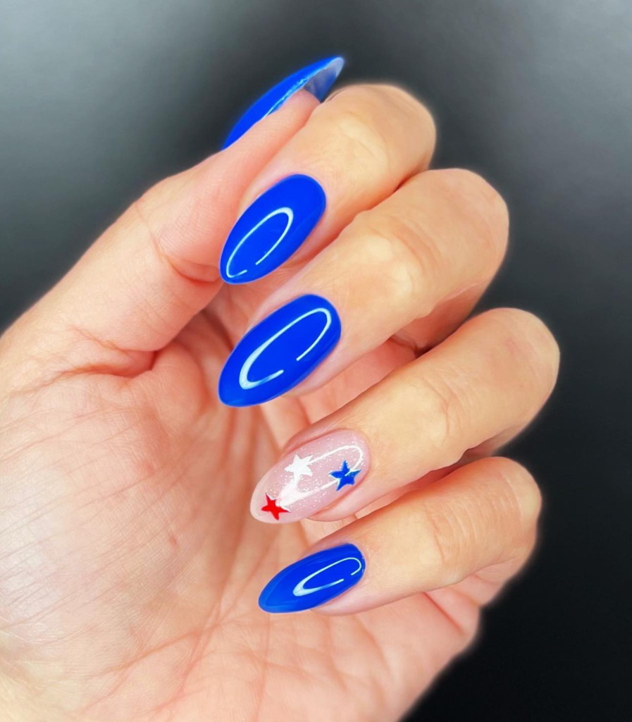 In the end, these almond-shaped nails are a strikingly blue with white stars that are the classic patriotic touch. The single striped nail not only is a great addition but also adds depth to the design, which in turn makes it both festive and chic for the holiday.