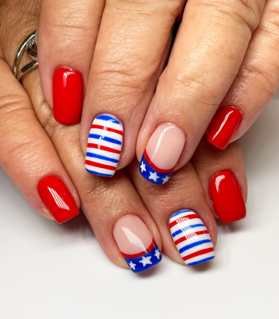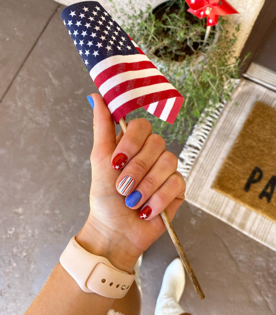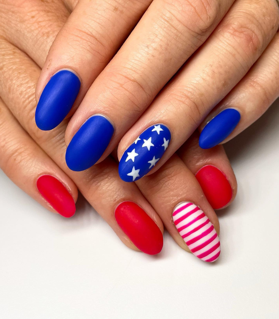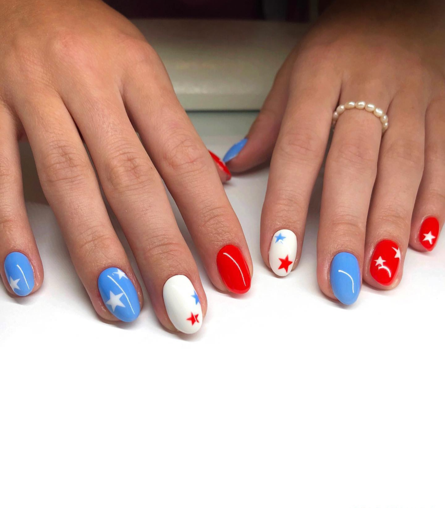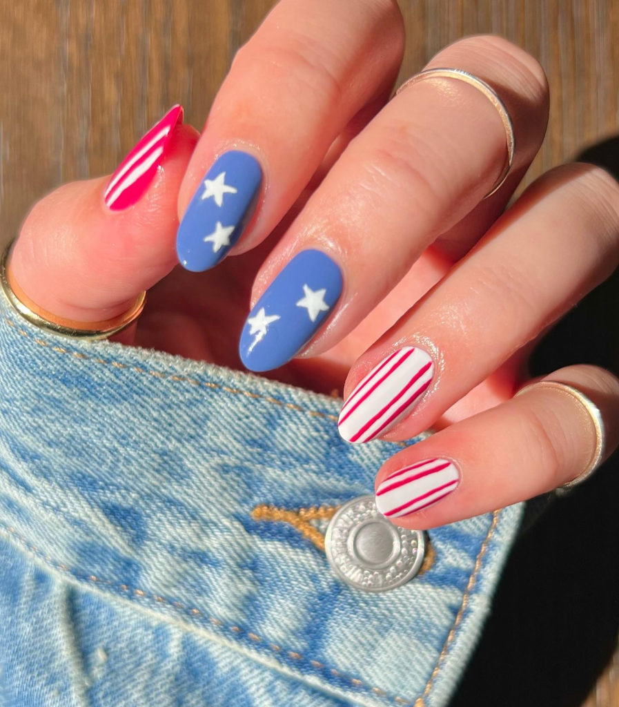 If you’re good at intricate nail art designs, this American flag set is for you. Alternate nails have stripes and stars on a backdrop of the traditional red, white, and blue. These oval-shaped nails short are not only pretty but also a way of celebrating on your fingertips.