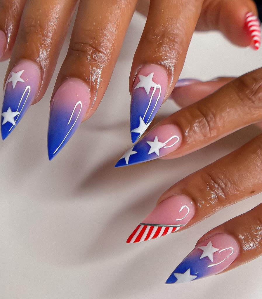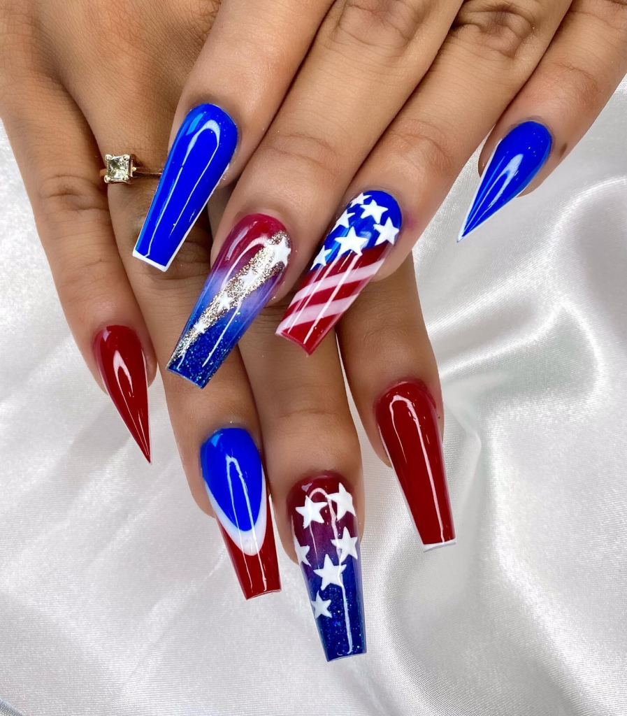 Geometry and patriotism are two things that must go this way, especially for the ones who display a preference to a modern design. The nails that represent the stars and stripes are actually a combination of various forms like tri, square, and trapezoid, and are colored in blue, red, and white just like the colors of the US flag. The straight and crisp lines along with the brilliant color contrast make them ideal choices for those who want their nails to be the talk of the town while celebrating Independence Day.
